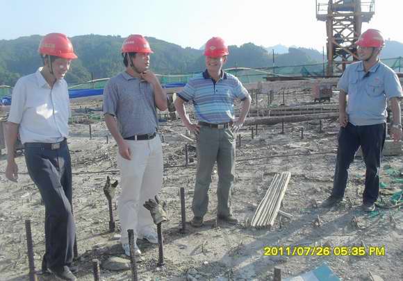 圖為:自治區(qū)交通運(yùn)輸廳王劼耘總工程師(右三)在拉會(huì)高架大橋施工現(xiàn)場調(diào)研指導(dǎo)