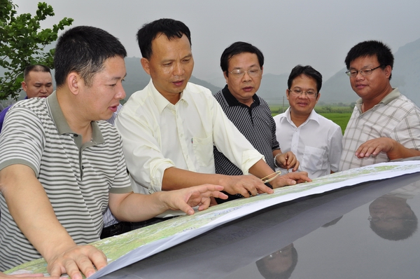 圖二:集團(tuán)公司李定倫總經(jīng)理(右4)、覃炳賢總工程師(右3)考察來賓至馬山、馬山至平果高速公路項(xiàng)目。