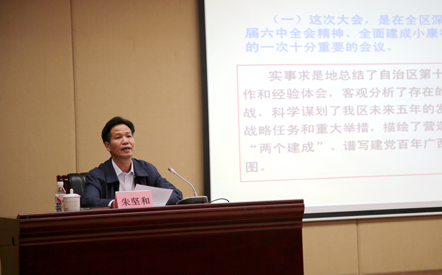在講解到深刻領(lǐng)會、準確把握黨代會精神時,朱堅和從七個方面講解了大會的重要精神和目標任務(wù)。其中,著重講解了今后五年全區(qū)發(fā)展的總體要求和奮斗目標,即營造“三大生態(tài)”、實現(xiàn)“兩個建成”。