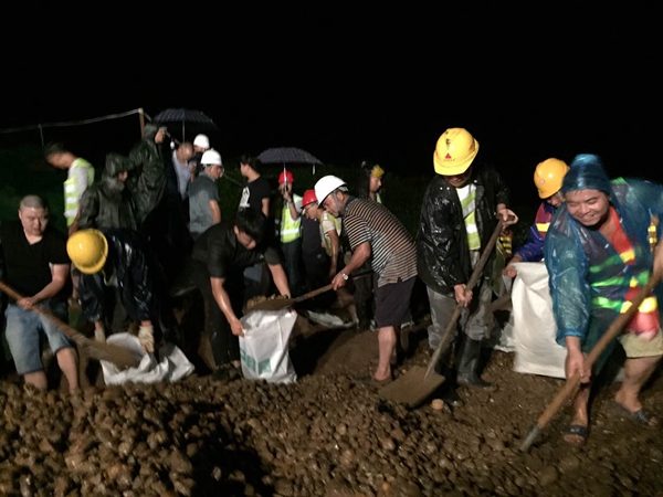 “十萬壟大堤出現(xiàn)險情,大家快去救援?!?月1日21時,湖南省湘潭市,廣西路橋集團環(huán)東路項目經理部項目常務副總工程師宋佩超立即組織項目經理部員工一起奔赴一線。當時湘潭市十萬壟湘江大堤出現(xiàn)直徑約20公分左右管涌,情況十分緊急,附近的新馬路項目部出動挖掘機和裝載機進行搶險救援。同時,項目經理部全體員工與當?shù)鼐仍犖橐黄鹋牌鹆碎L龍,齊聲喊著口號“一二”、“一二”裝沙袋、傳運沙袋,幫助封堵大堤漏洞。