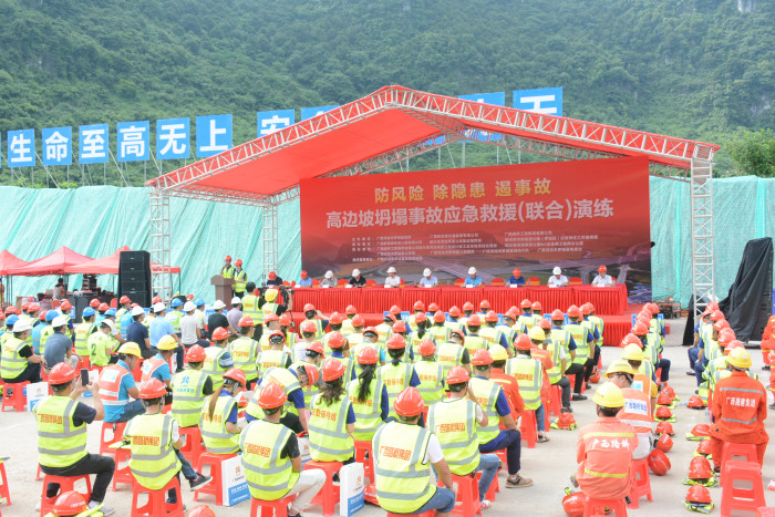 作為“防風險 除隱患 遏事故”主題“安全生產(chǎn)月”活動內(nèi)容之一,該演練結(jié)合融水至河池高速公路項目施工中存在的高邊坡坍塌重大危險源的特點,旨在加強參建人員安全防范意識,提高安全應(yīng)急處置、救援能力。