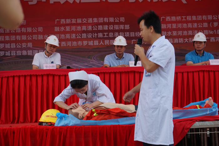 當天的演練現(xiàn)場模擬情景為:2019年6月20日,在羅城縣四把鎮(zhèn)沖灣屯附近,融河高速公路K54+100高邊坡處現(xiàn)場4名邊坡防護作業(yè)人員正在緊張的施工,由于連續(xù)雨天上邊坡坡頂土體部分突然滑落,繼而出現(xiàn)大的滑坡裂縫,隨之大面積土石體坍塌,1名施工人員被垮塌的土石壓埋。事故發(fā)生后,參與演練人員及時報告和啟動應(yīng)急預(yù)案,在坍塌現(xiàn)場設(shè)置臨時指揮部,指揮現(xiàn)場救援,將傷者抬出被困位置后,在演練會場進行現(xiàn)場醫(yī)療和急救演示,再由救護車送到羅城縣人民醫(yī)院進一步治療。